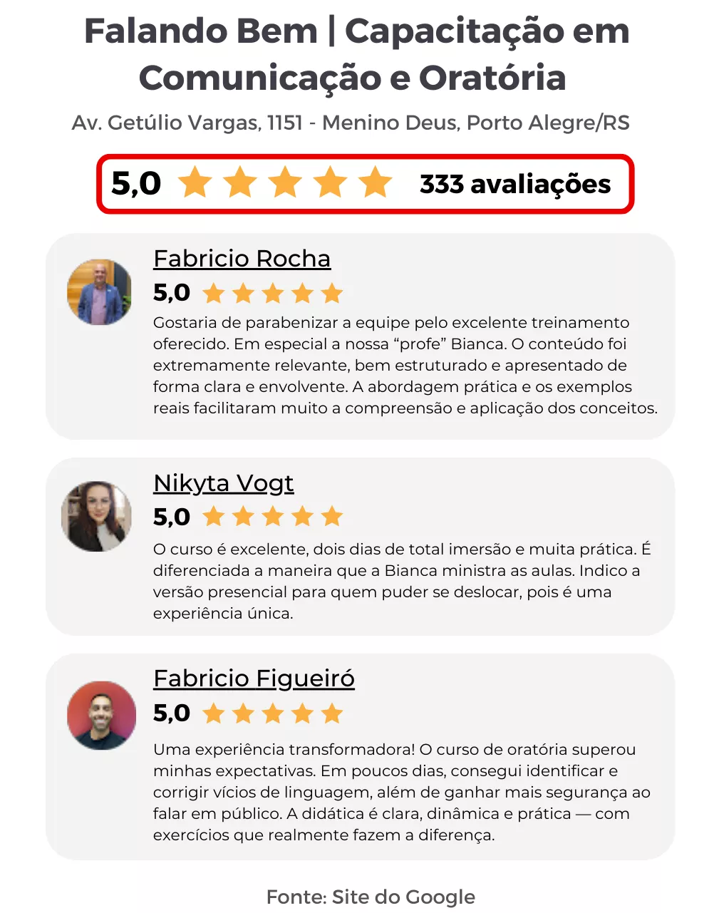 Com muito orgulho, a Falando Bem Capacitação em Comunicação, hoje ultrapassa fronteiras e ajuda milhares de pessoas no Brasil e no exterior (EUA, Europa, Ásia...) a destravarem sua comunicação e alavancarem suas carreiras com mais autoconfiança.