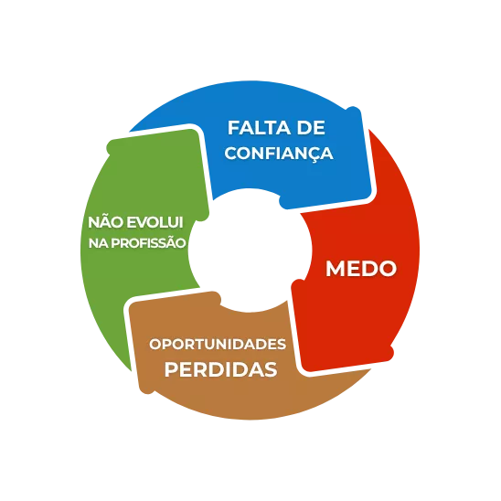 Consequentemente não há evolução profissional e isto baixa a autoconfiança. Quem fica nesse ciclo nunca irá desenvolver a competência comunicacional em frente ao público.